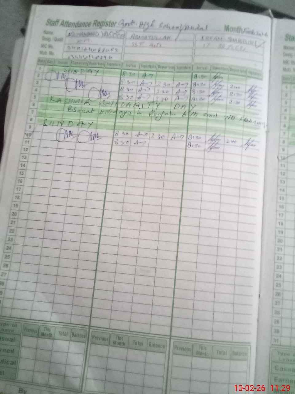 | CNIC | Full Name | Designation | R/C | Absence During Last Calender Month |