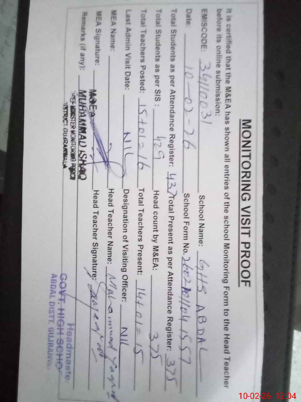 | EMIS Code: 34110031 | Name of School: GHS ABDAL | |||