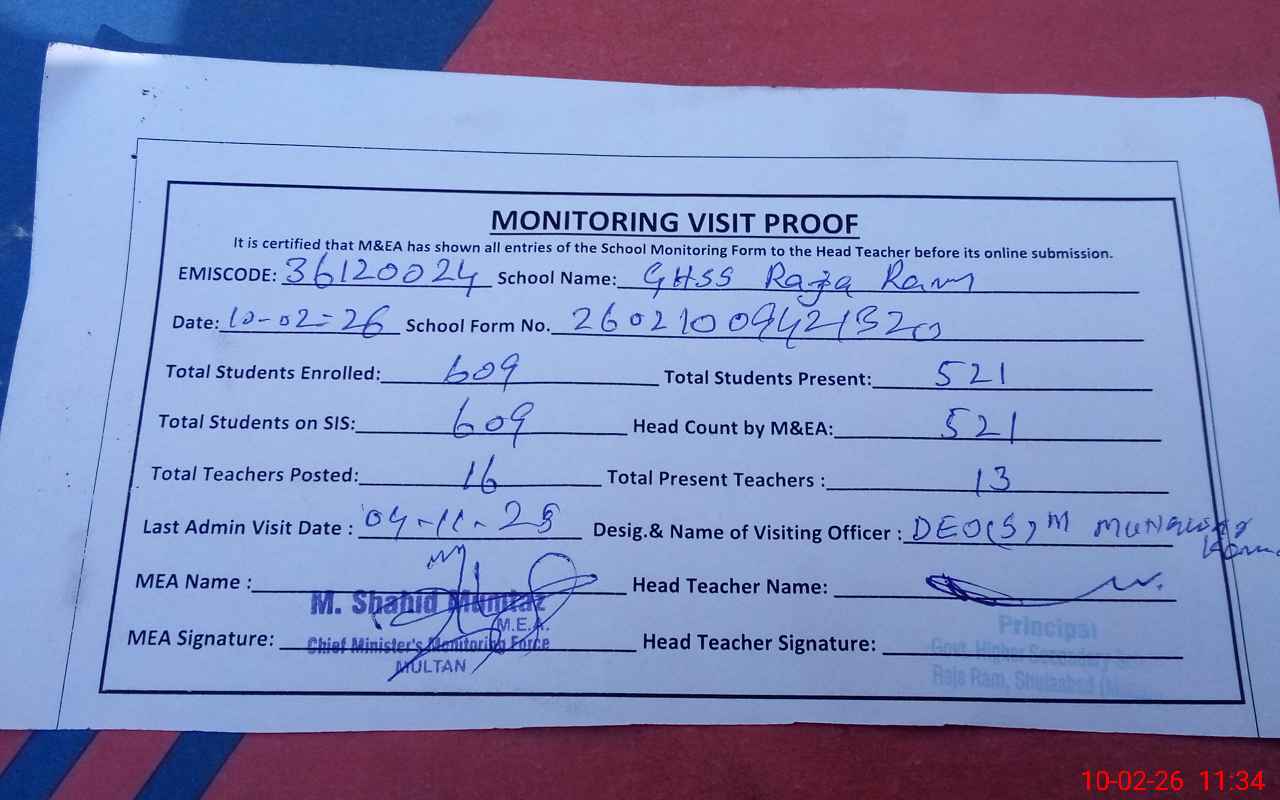 | EMIS Code: 36120024 | Name of School: GHSS RAJA RAM SHUJABAD | |||