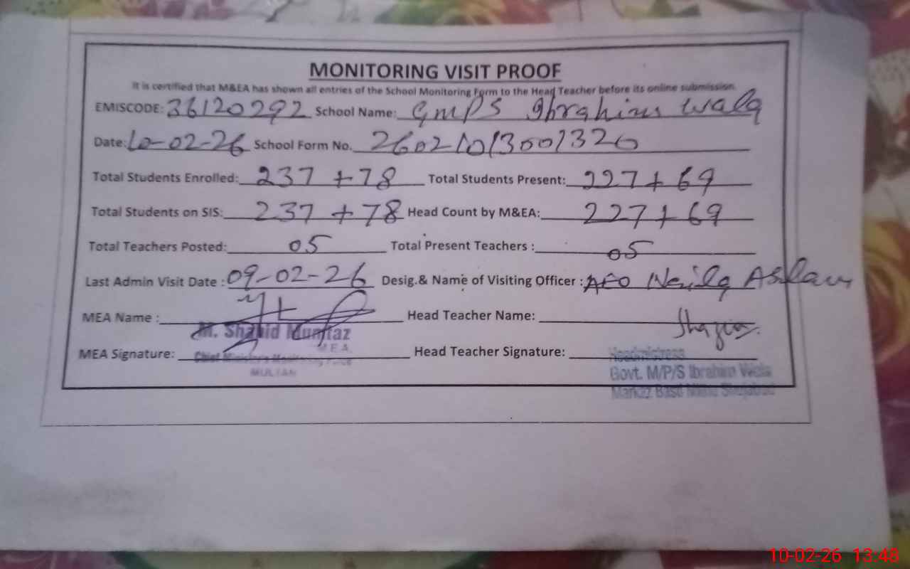 | EMIS Code: 36120292 | Name of School: GMPS IBRAHIM WALA SHUJABAD | |||