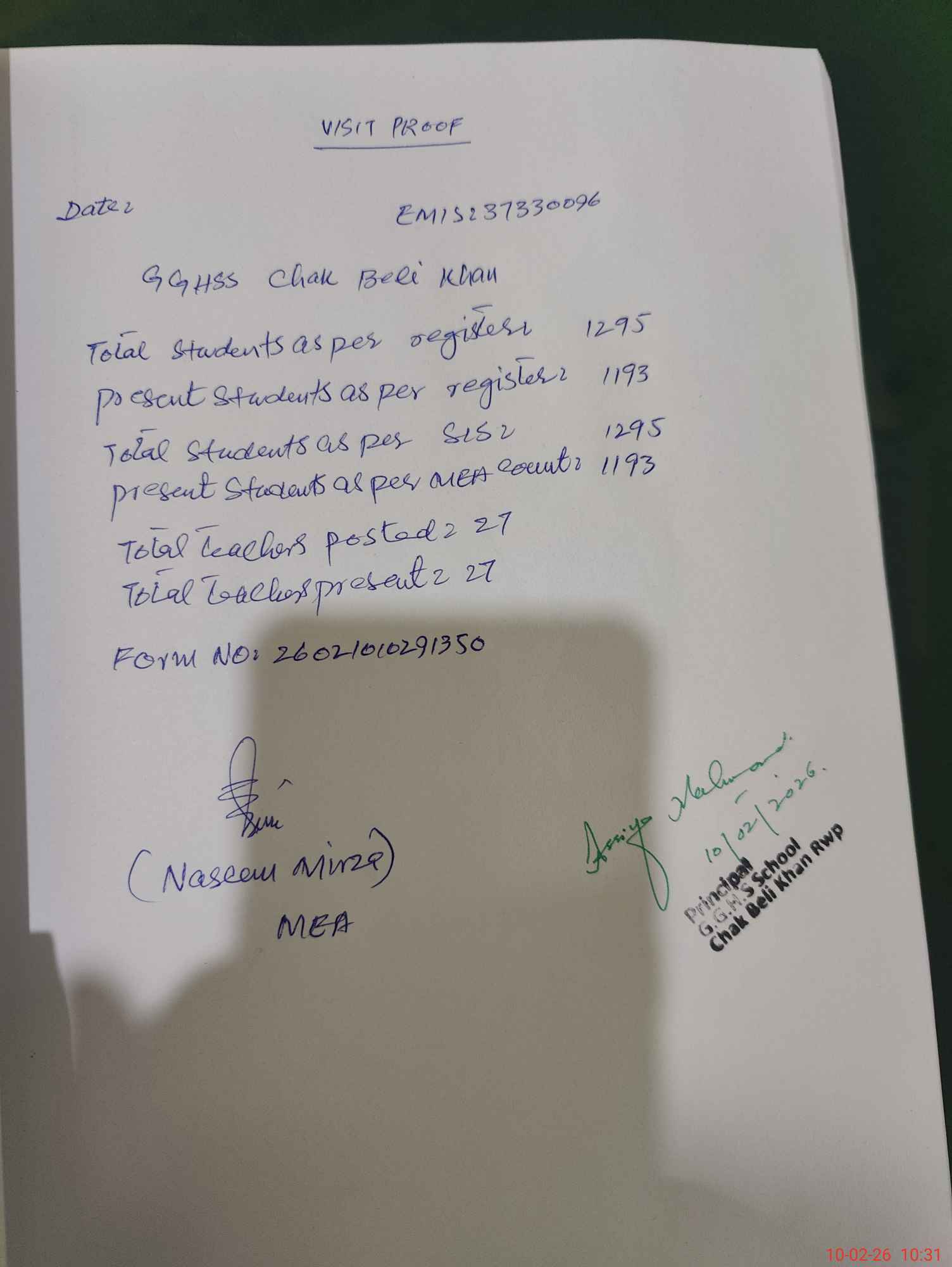 | Attendance Register | Head Teacher | MEA with School | Visit Proof |