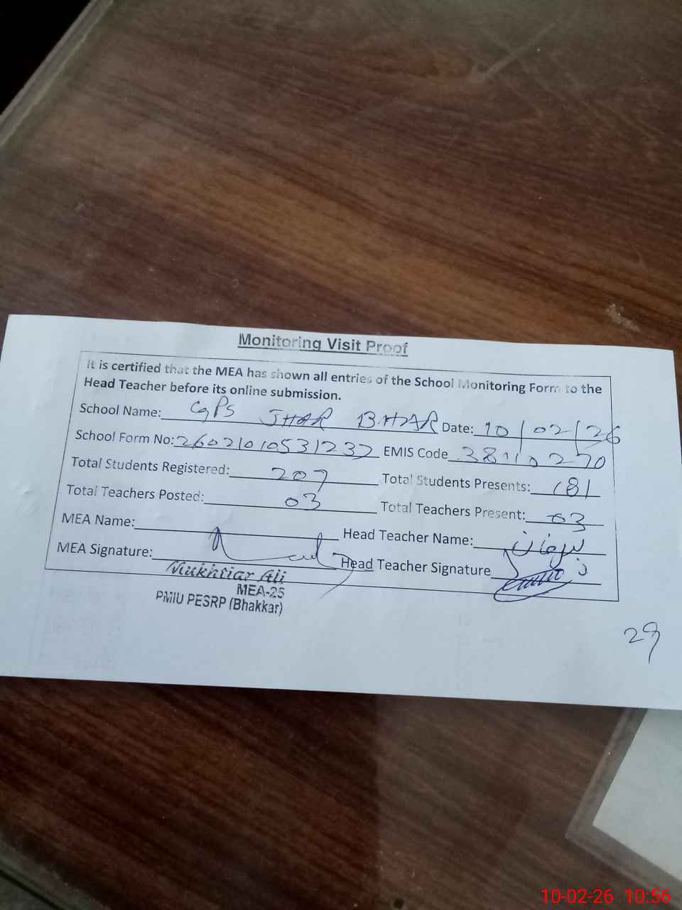 | Monitoring Date: 10-02-2026 | Start Time: 10-02-2026 10:28 AM | End Time: 10-02-2026 10:56 AM | Name of MEA: Mu**** Al**** | |