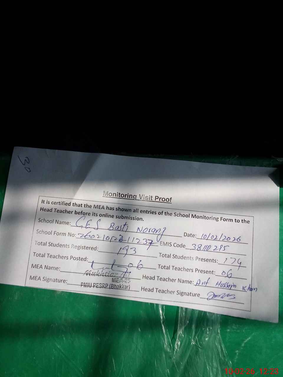 | Monitoring Date: 10-02-2026 | Start Time: 10-02-2026 12:00 PM | End Time: 10-02-2026 12:24 PM | Name of MEA: Mu**** Al**** | |