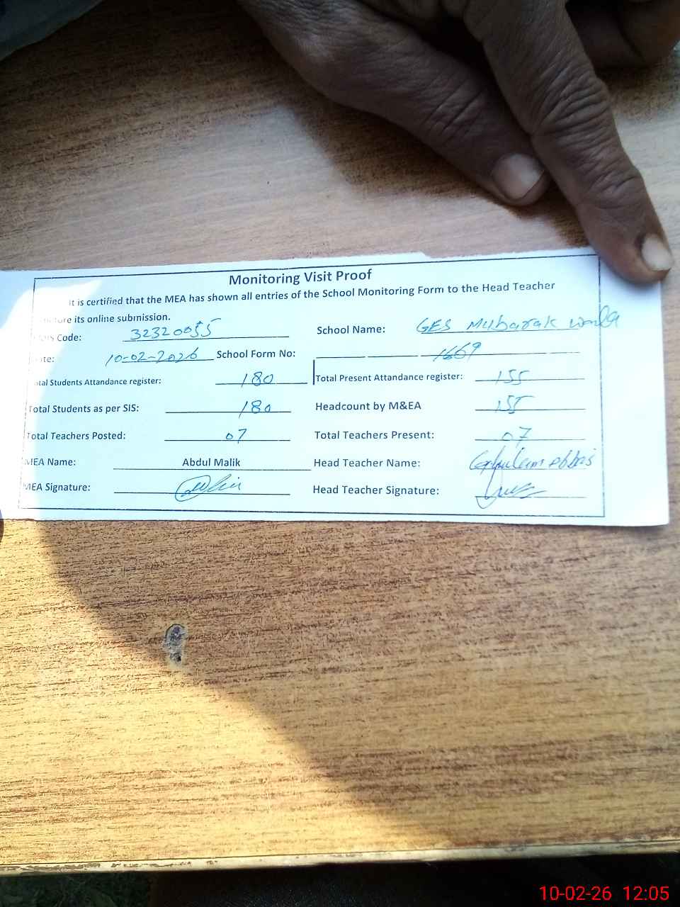 | Attendance Register | Head Teacher | MEA with School | Visit Proof |