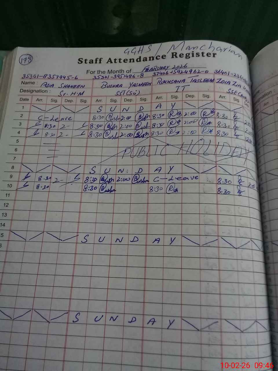 | CNIC | Full Name | Designation | R/C | Absence During Last Calender Month |