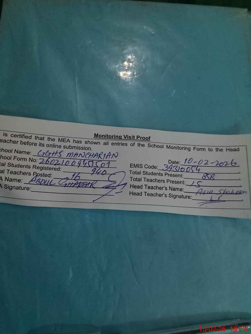 | Certified that this School was Inspected by the Undersigned MEA/DMO Today and the Information Stated Above is as Per Record. | |||||