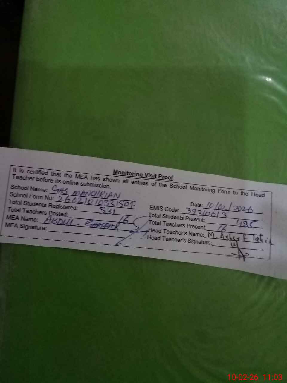 | EMIS Code: 39310013 | Name of School: GHS MANCHRIAN | |||