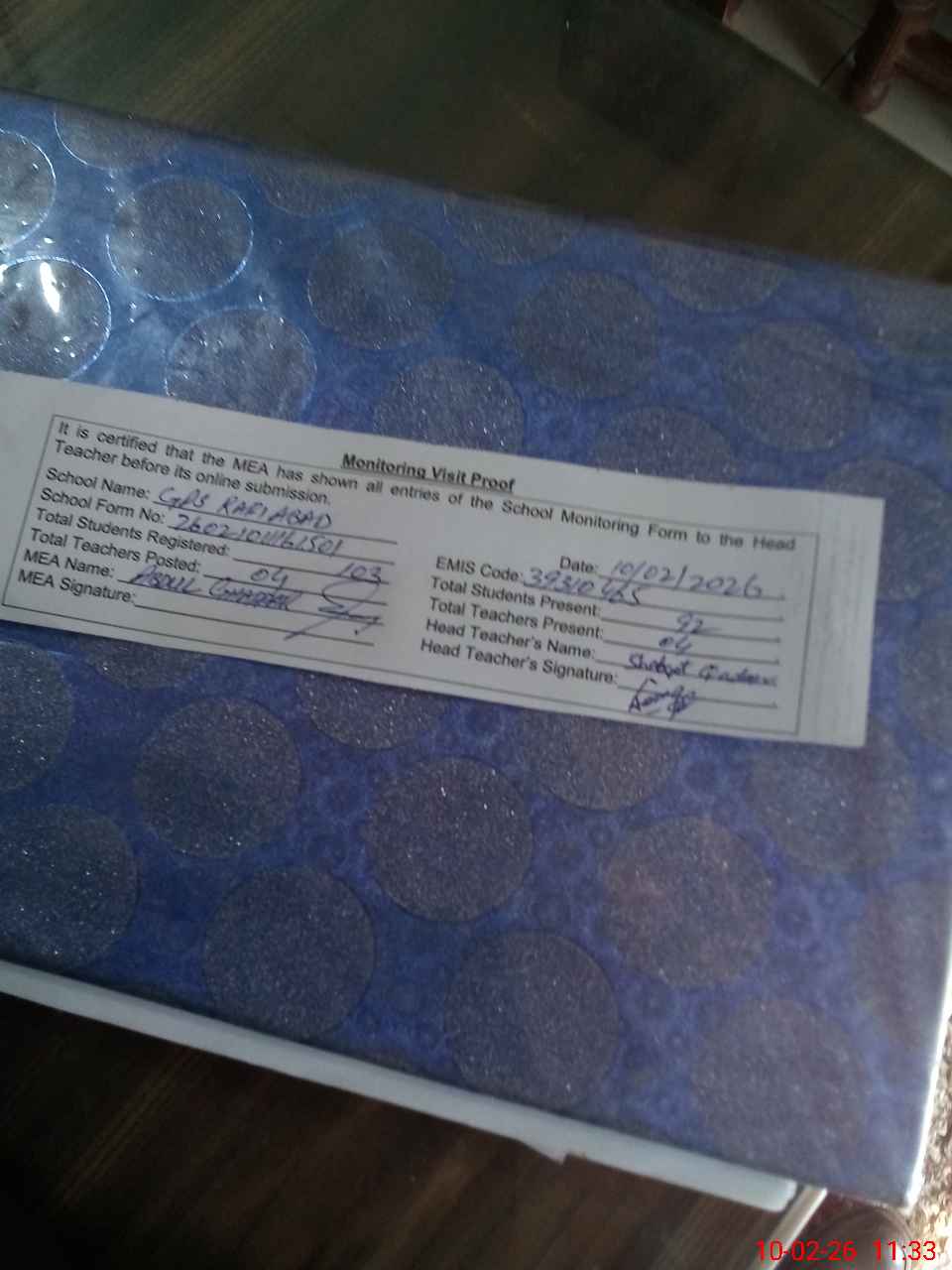 | Attendance Register | Head Teacher | MEA with School | Visit Proof |