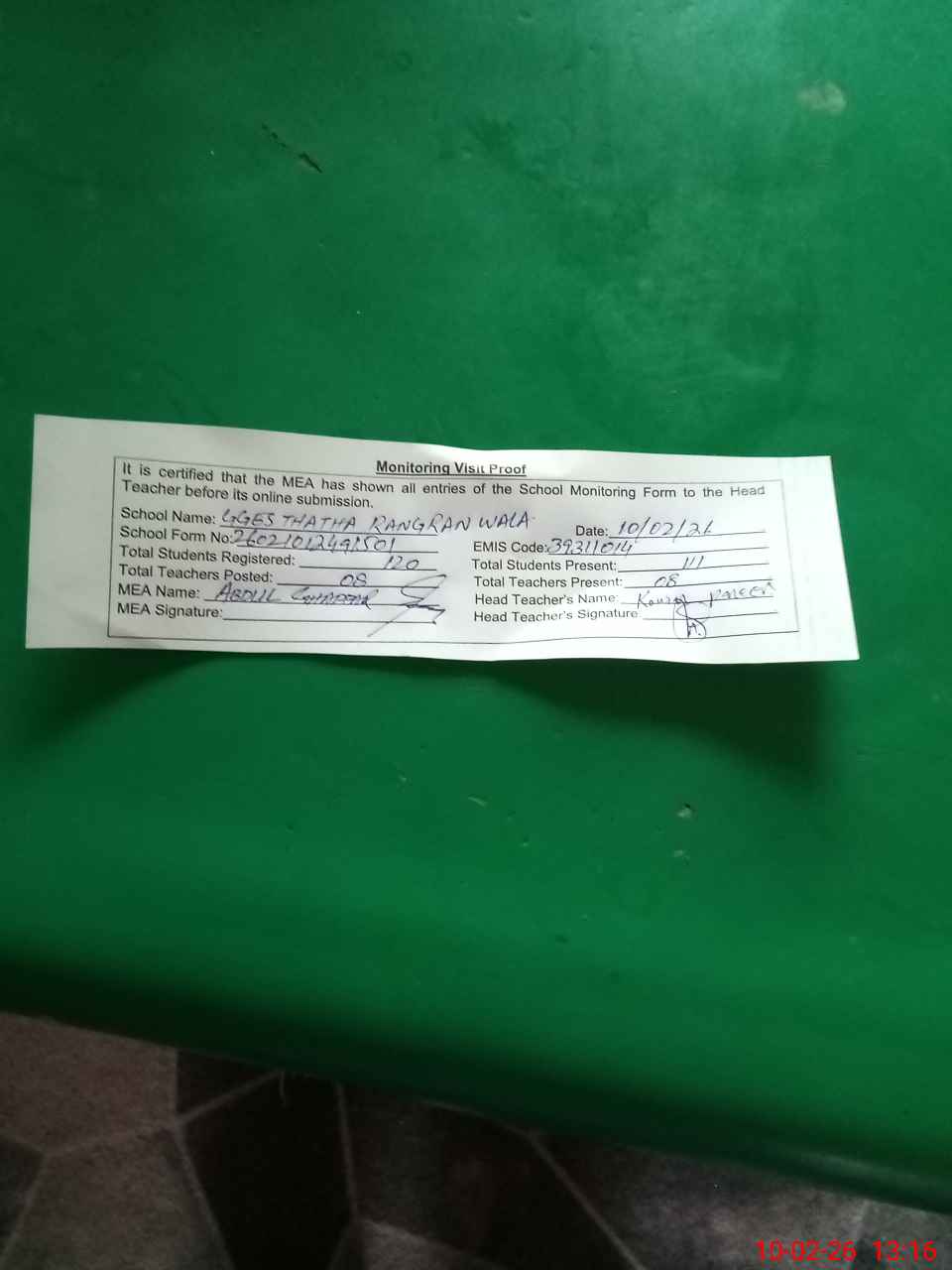 | Attendance Register | Head Teacher | MEA with School | Visit Proof |