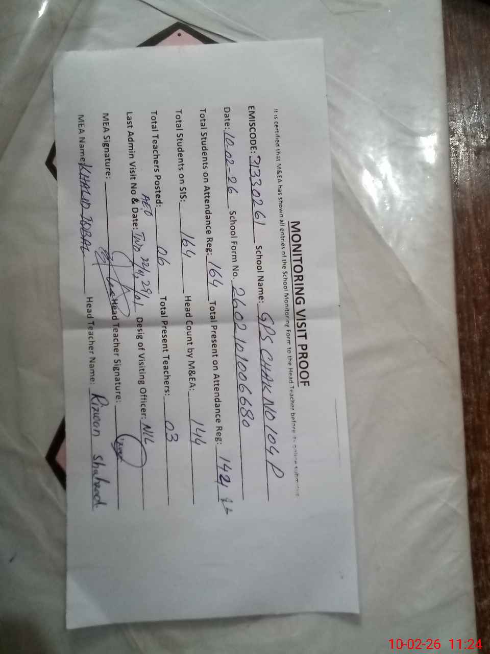 | EMIS Code: 31330261 | Name of School: GPS CHAK NO. 104/P | |||