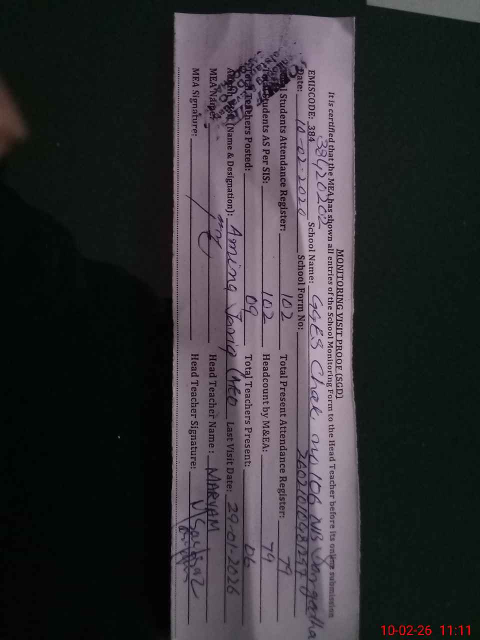 | Attendance Register | Head Teacher | MEA with School | Visit Proof |