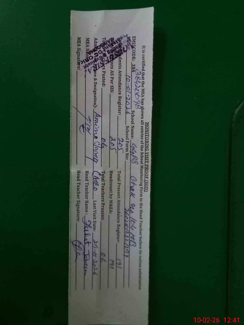 | Certified that this School was Inspected by the Undersigned MEA/DMO Today and the Information Stated Above is as Per Record. | |||||