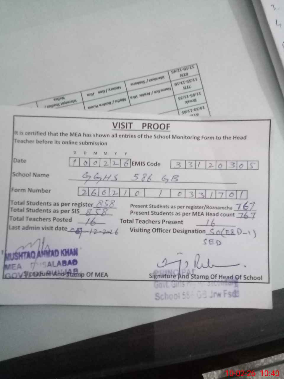 | Certified that this School was Inspected by the Undersigned MEA/DMO Today and the Information Stated Above is as Per Record. | |||||