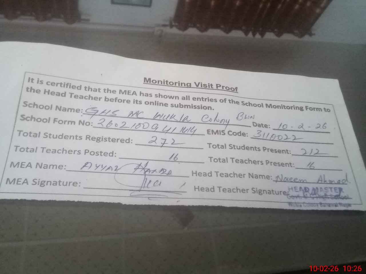 | EMIS Code: 31110022 | Name of School: GHS MC WUKLA COLONY BAHAWALNAGAR | |||
