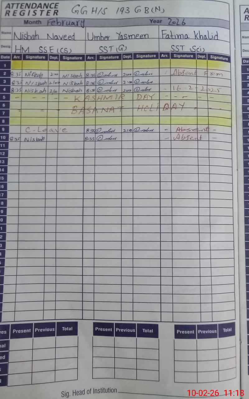 | Remarks (Use Separate Page if Required): NSB CASH BOOK NOT MAINTAINED SPECIALLY DEVICE BILLS AND ELECTRICITY BILLS ARE DEPOSITED DOUBLE TRIPPLE TIME TO CONSUME THE NSB AMOUNT PLZ LOOK INTO THIS MATTER. COMPUTER LAB NON FUNCTIONAL. PRIVATE TEACHER WITH OUT RECORD AND AFTER INQUIRING IT WAS FOUND THAT SALARY WAS PAID OUT OF TUCK SHOP INCOME. SST FATMA KHALID UNAUTHORIZED ABSENT SINCE 16 FEBRUARY 2025. NO VISIT OF AUTHORITIES SINCE LAST 06XYEARS APPROXIMATELY. | |||||
