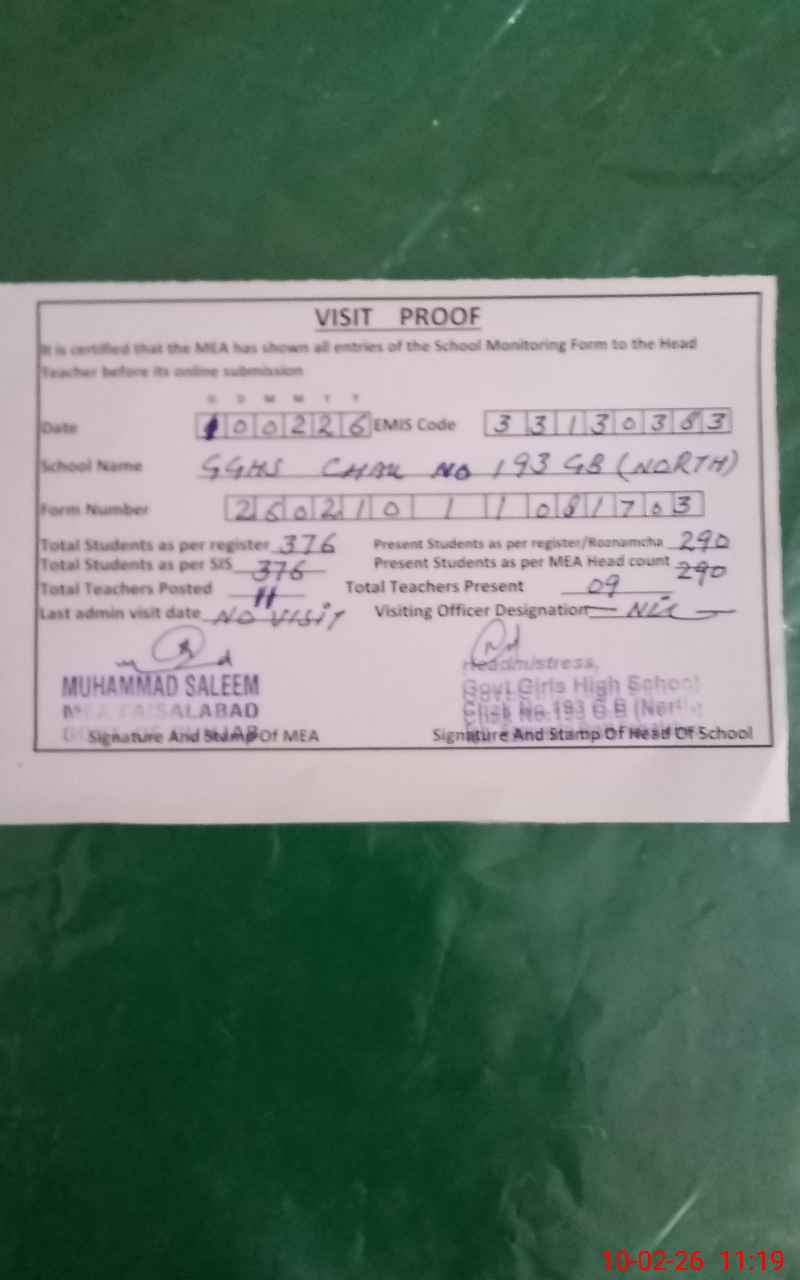 | EMIS Code: 33130383 | Name of School: GGHS CHAK NO 193 GB N | |||