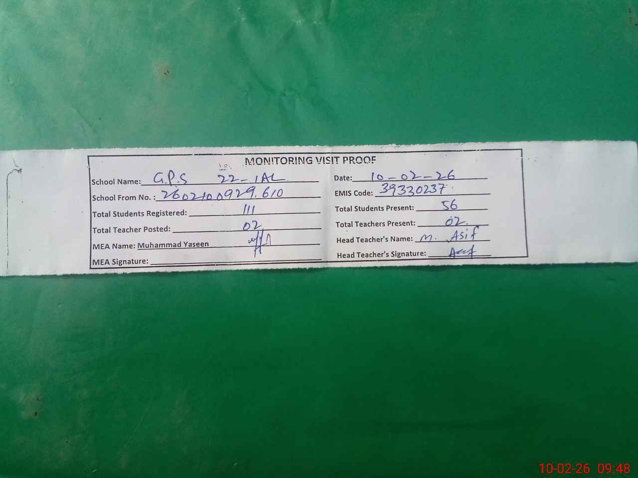 | EMIS Code: 39330237 | Name of School: GPS CHAK 22/1-AL | |||