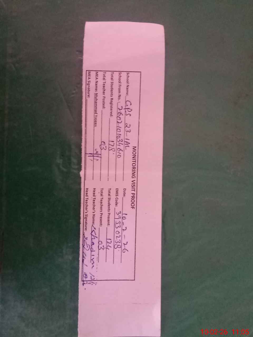 | Attendance Register | Head Teacher | MEA with School | Visit Proof |