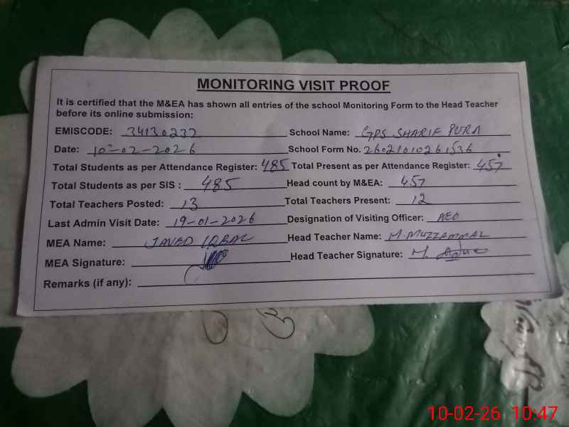 | EMIS Code: 34130232 | Name of School: GPS SHARIF PURA | |||