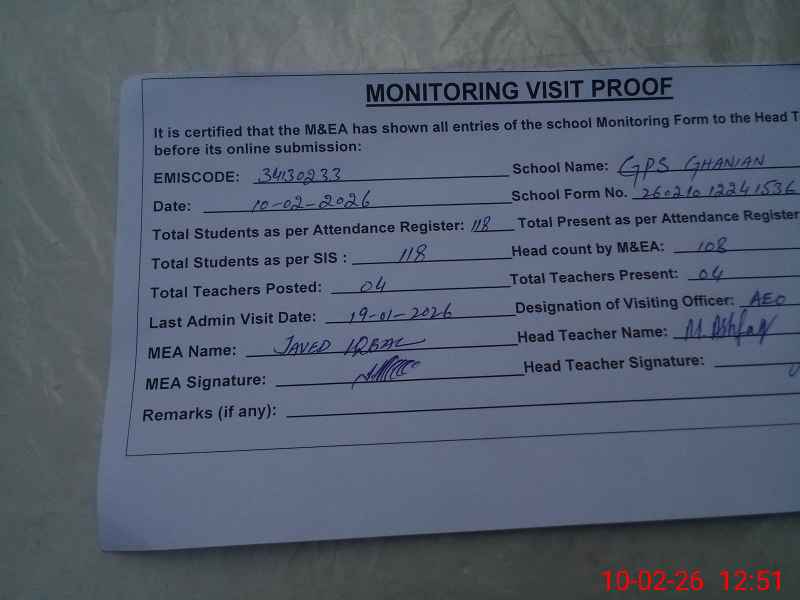 | EMIS Code: 34130233 | Name of School: GPS GHANIAN KOHNA | |||