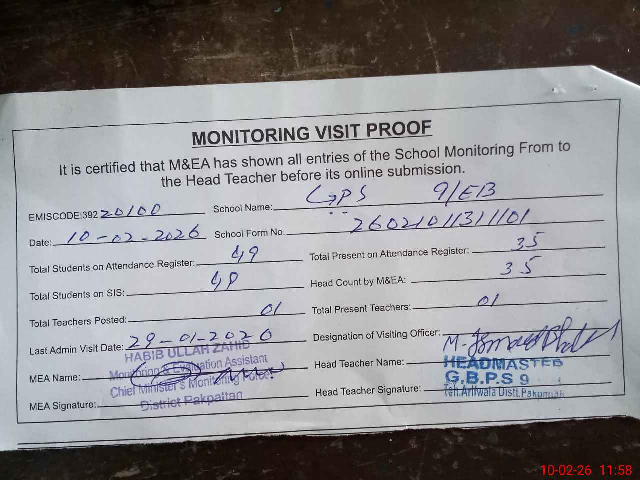 | Attendance Register | Head Teacher | MEA with School | Visit Proof |