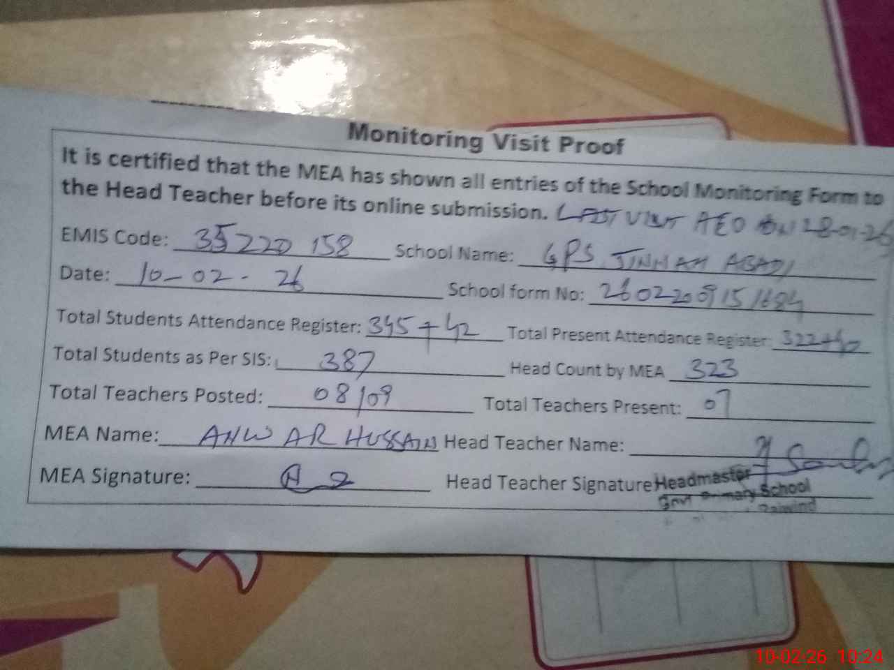 | Attendance Register | Head Teacher | MEA with School | Visit Proof |