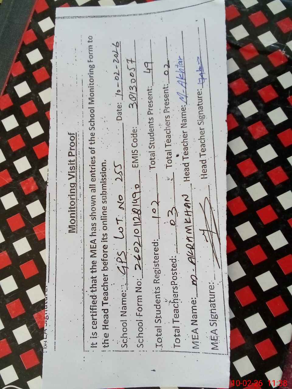 | Certified that this School was Inspected by the Undersigned MEA/DMO Today and the Information Stated Above is as Per Record. | |||||