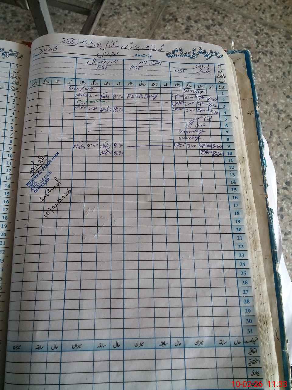 | CNIC | Full Name | Designation | R/C | Absence During Last Calender Month |