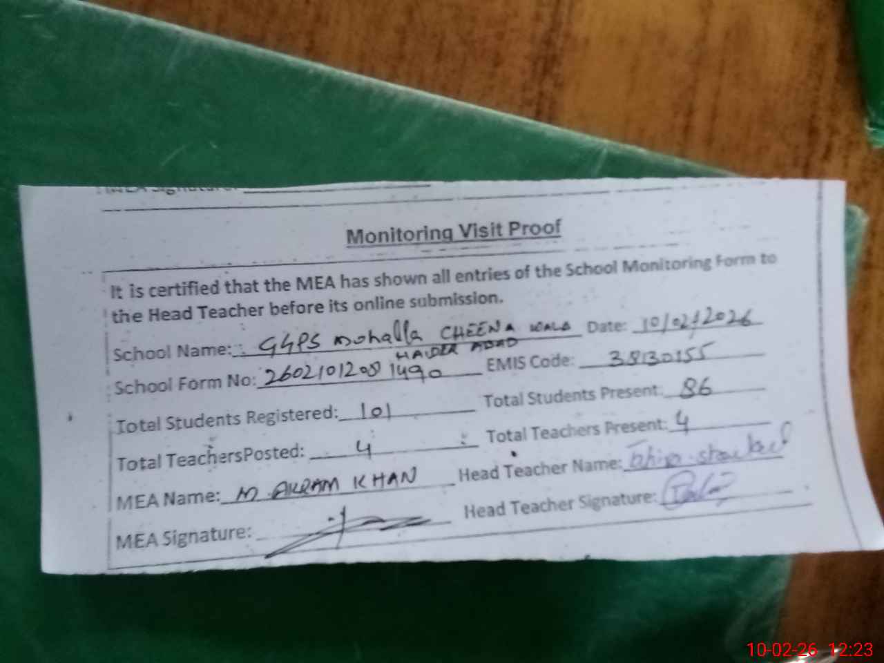 | Attendance Register | Head Teacher | MEA with School | Visit Proof |