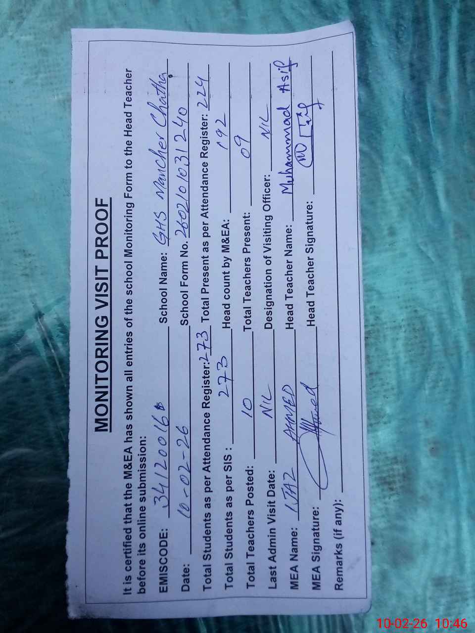 | EMIS Code: 34120016 | Name of School: GHS MANCHER CHATHA | |||