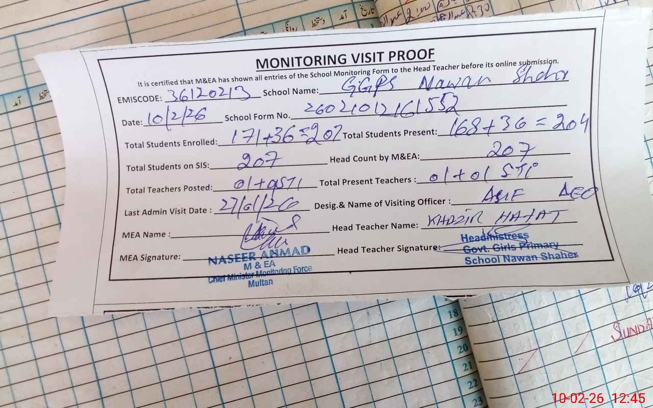| EMIS Code: 36120213 | Name of School: GGPS NAWAN SHER SHUJABAD DISTT. MULTAN | |||