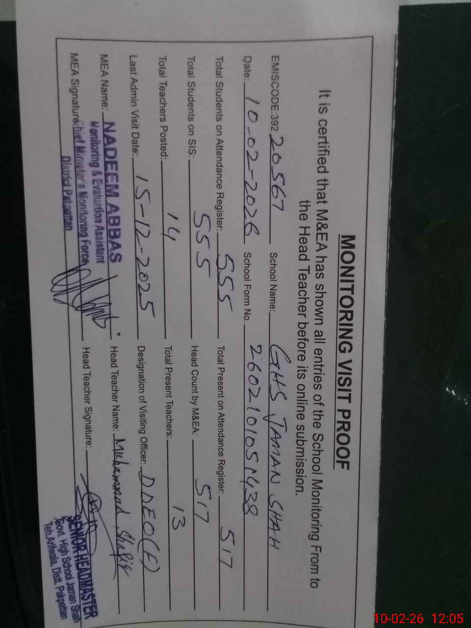 | Certified that this School was Inspected by the Undersigned MEA/DMO Today and the Information Stated Above is as Per Record. | |||||