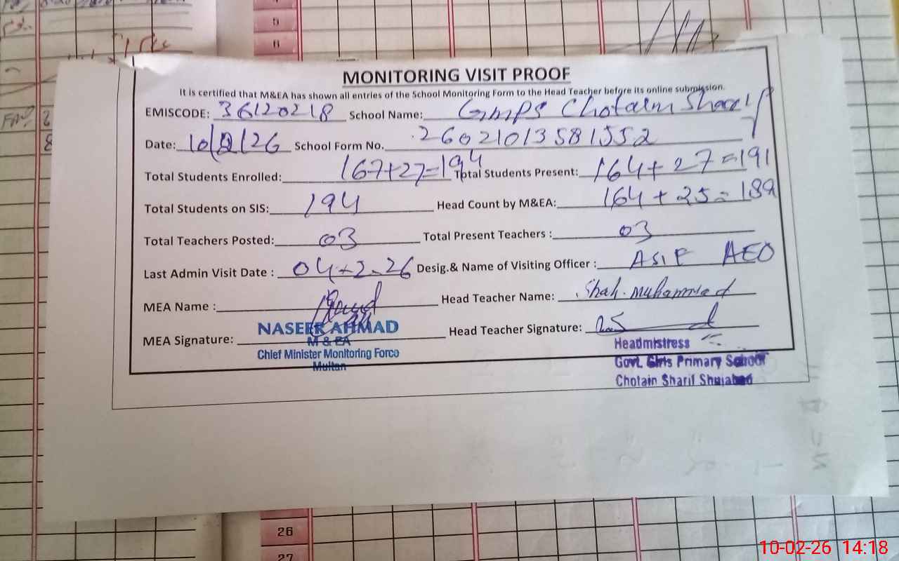 | EMIS Code: 36120218 | Name of School: GMPS CHOTAIN SHARIF | |||