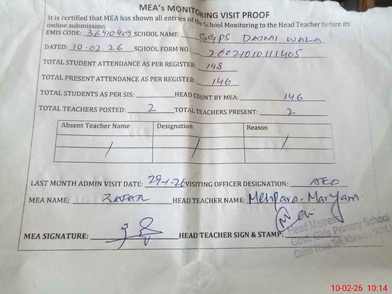 | Attendance Register | Head Teacher | MEA with School | Visit Proof |