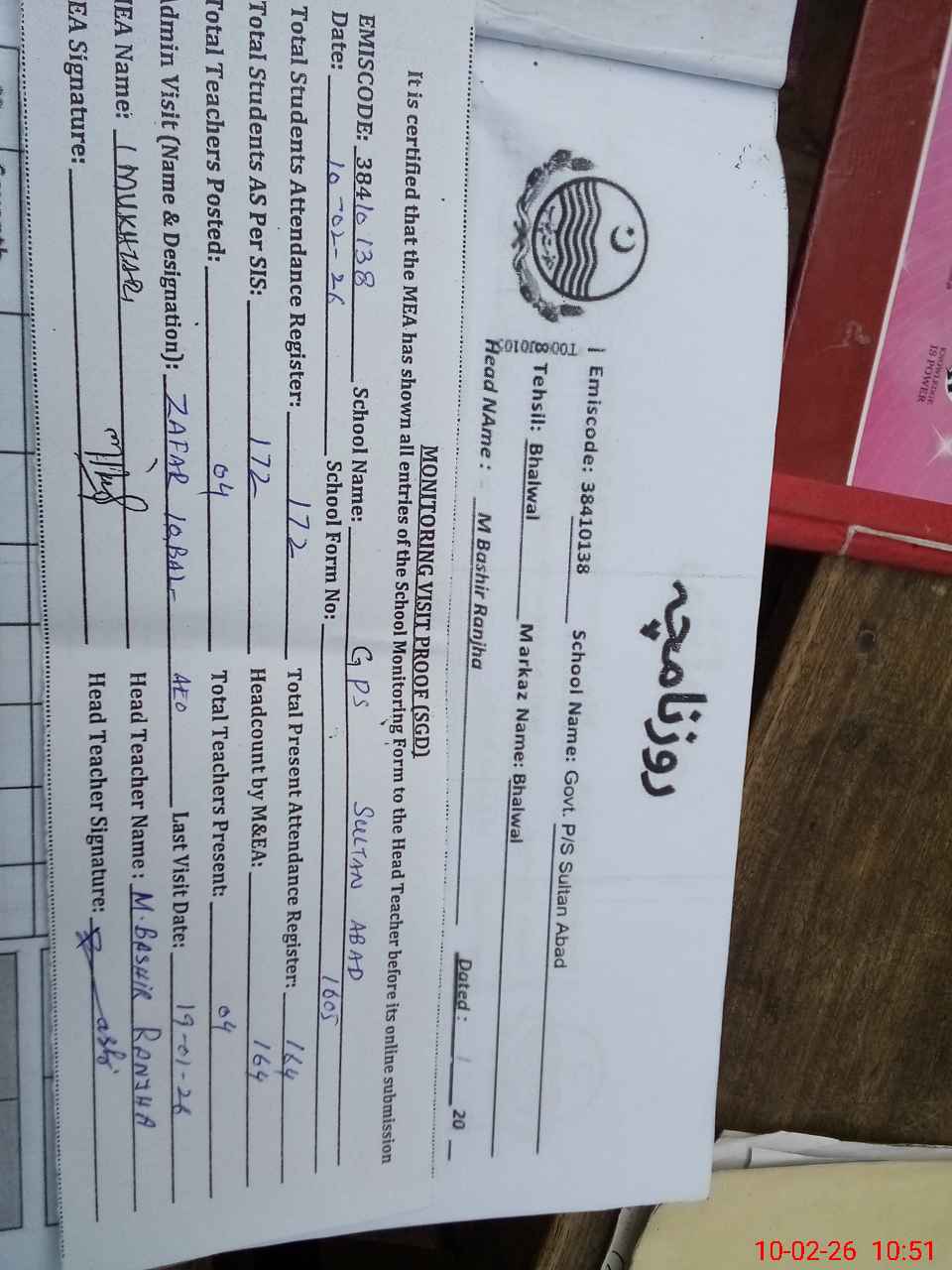 | EMIS Code: 38410138 | Name of School: GPS SULTAN ABAD | |||