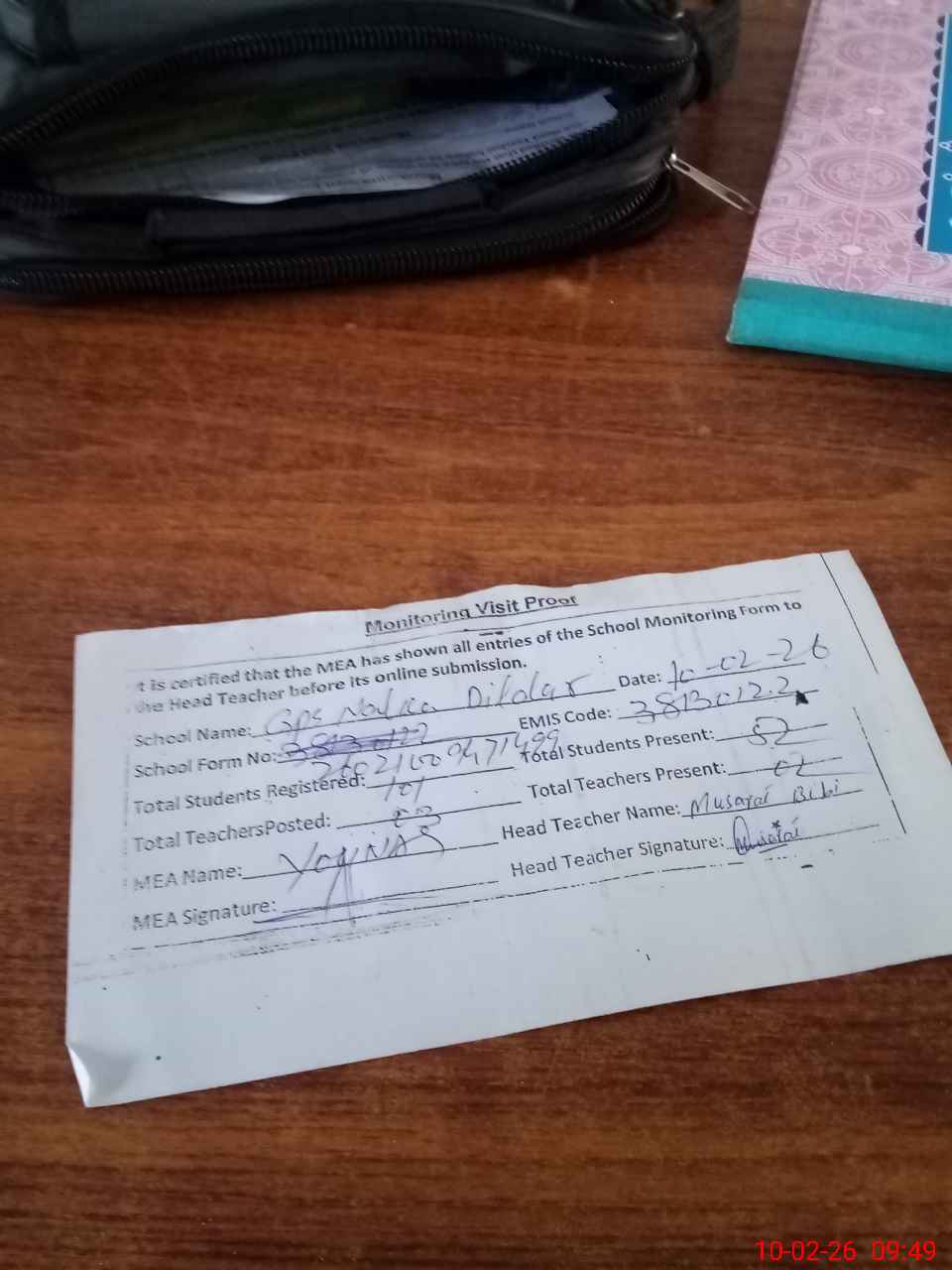 | Total no. of Classrooms: 2 No. of Classrooms Used for Teaching: 2 No. of Classrooms Storing Old Furniture, FTBs, etc: 0Comments if Any: NSB and FTF record was not shown because headteacher was absent |