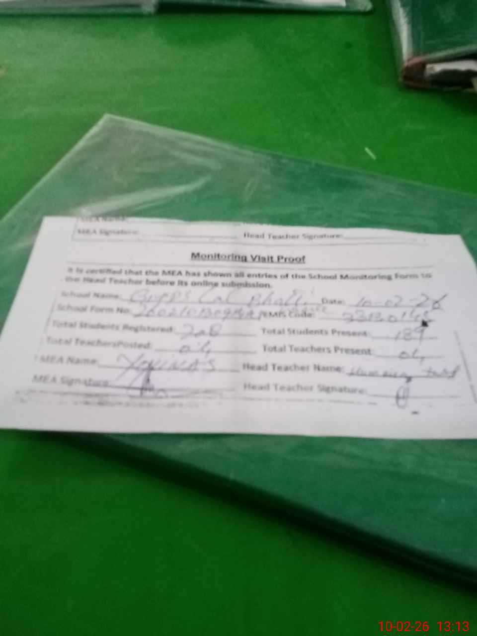 | Attendance Register | Head Teacher | MEA with School | Visit Proof |