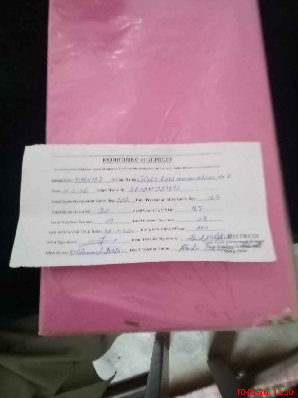 | Attendance Register | Head Teacher | MEA with School | Visit Proof |