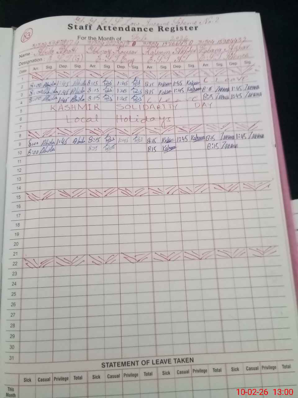 | CNIC | Full Name | Designation | R/C | Absence During Last Calender Month |