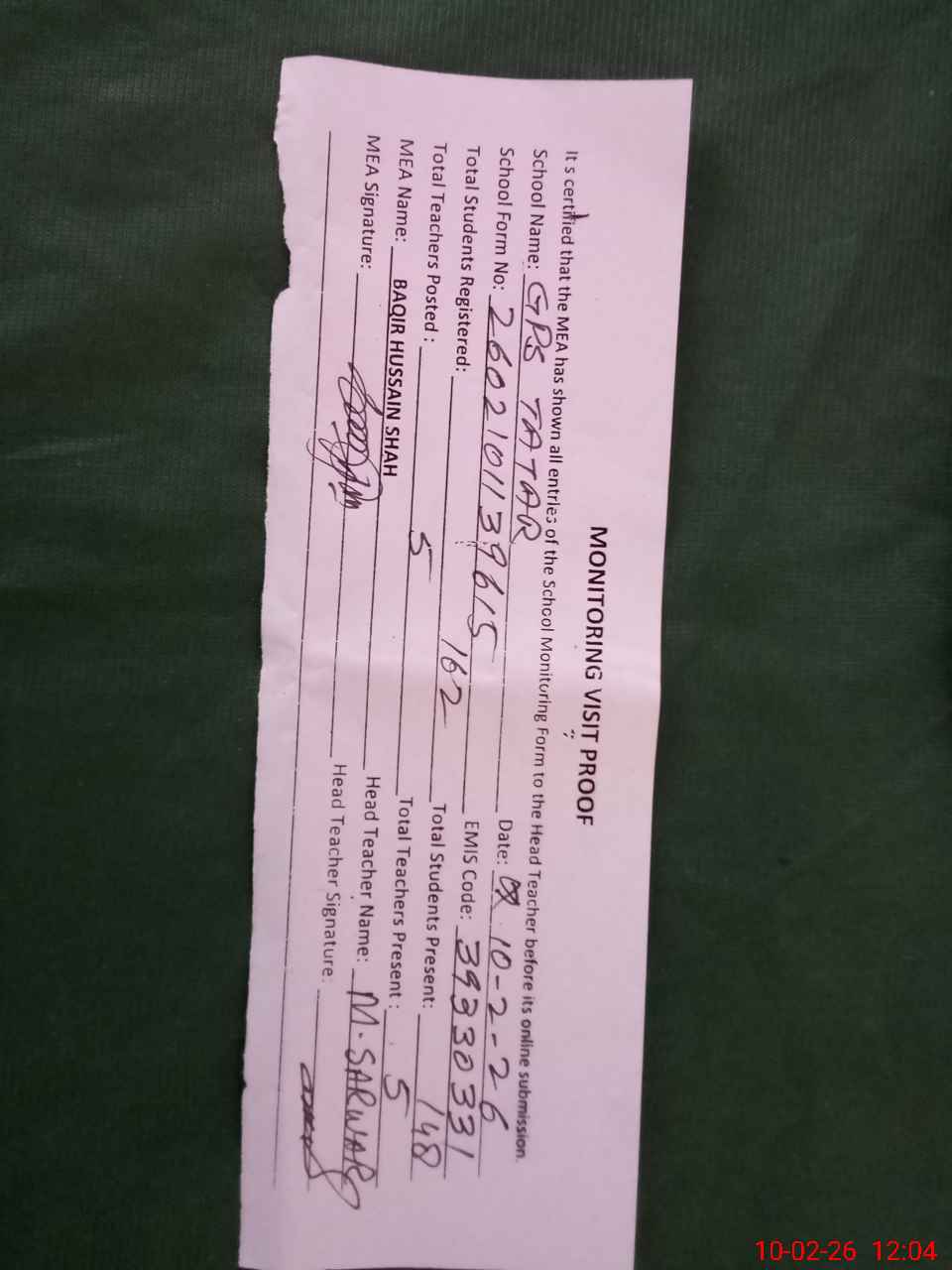 | EMIS Code: 39330331 | Name of School: GPS TATAR | |||