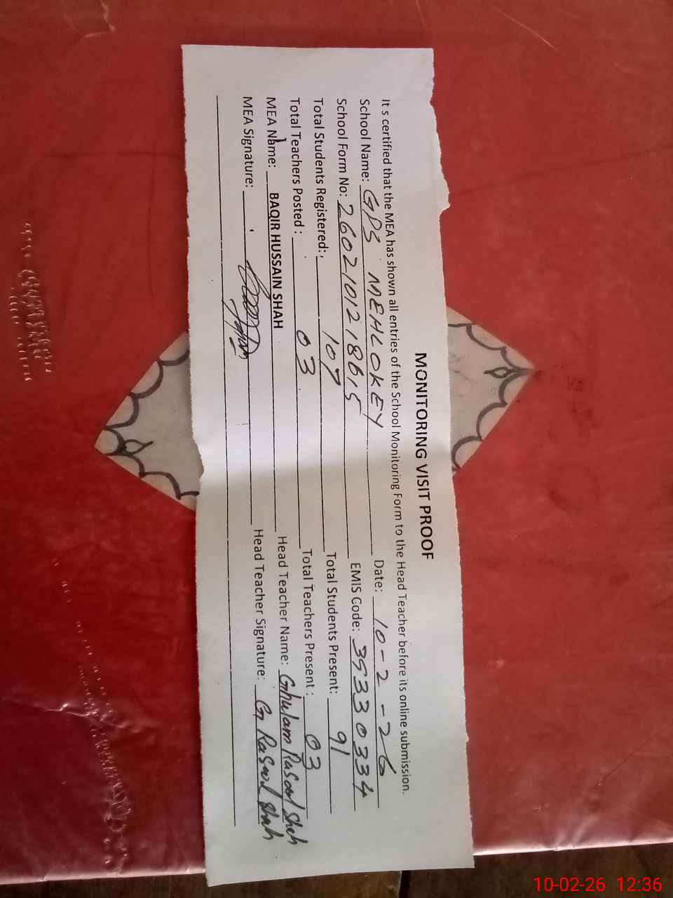 | Attendance Register | Head Teacher | MEA with School | Visit Proof |