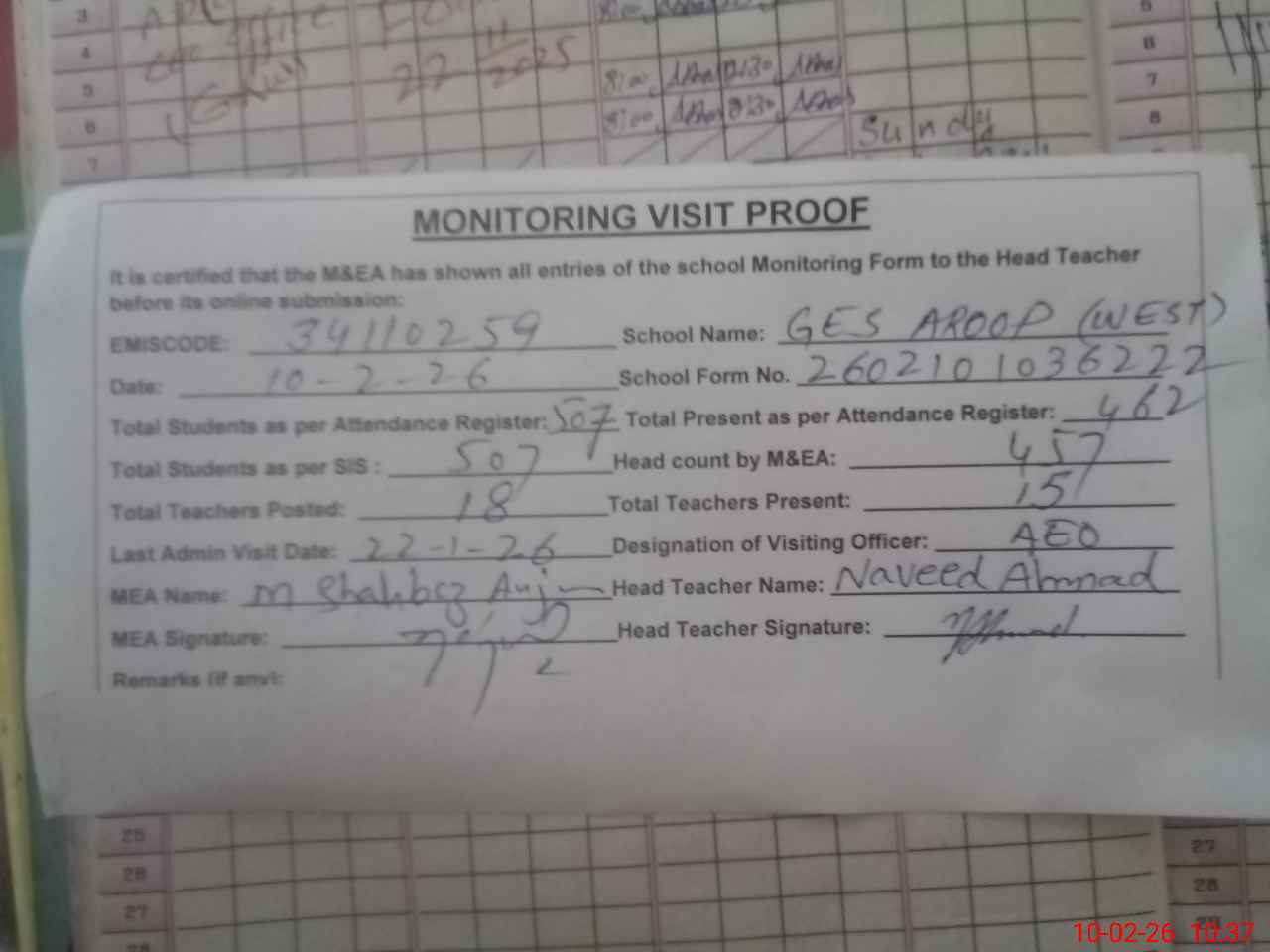 | Attendance Register | Head Teacher | MEA with School | Visit Proof |