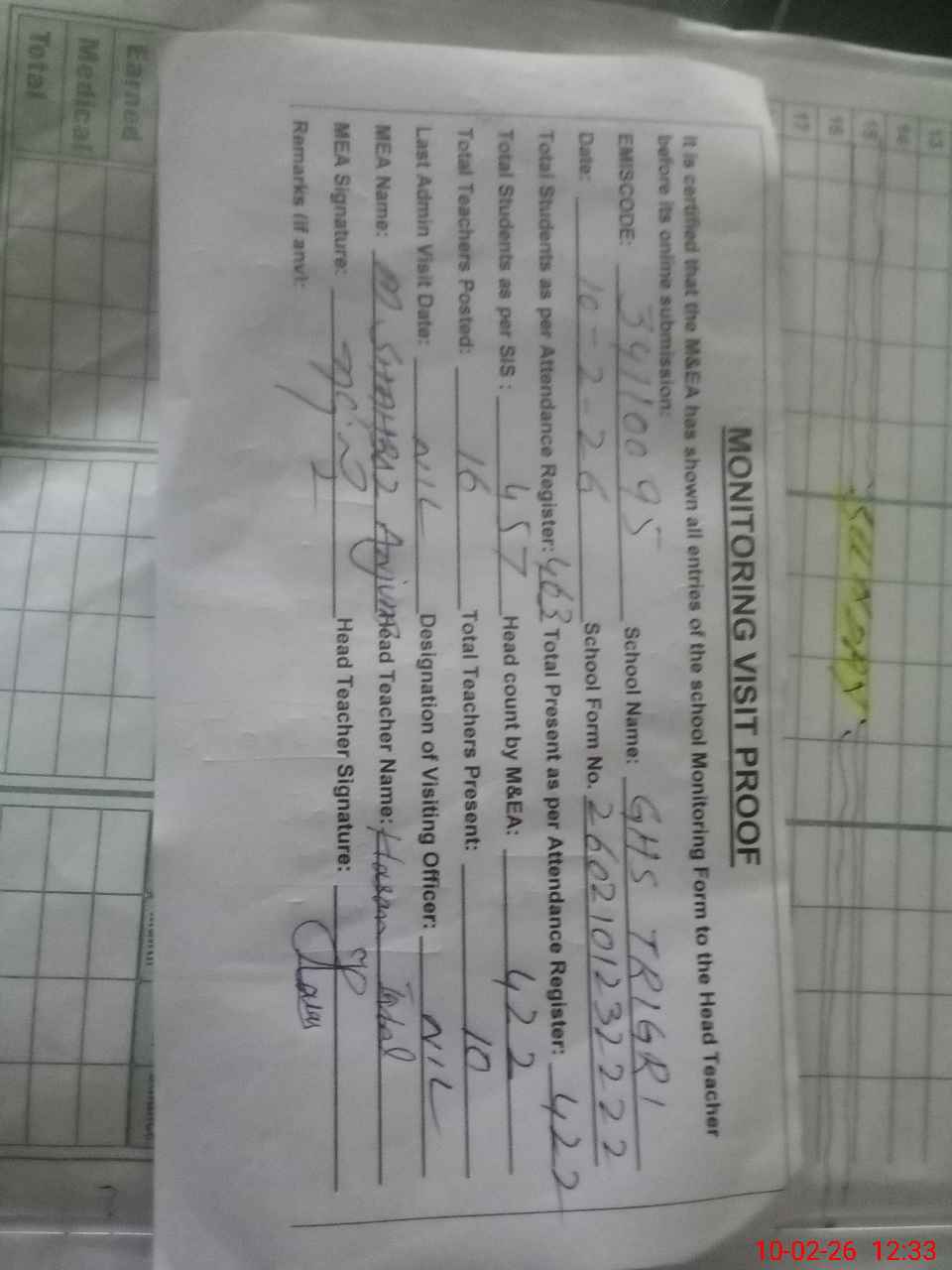 | Attendance Register | Head Teacher | MEA with School | Visit Proof |