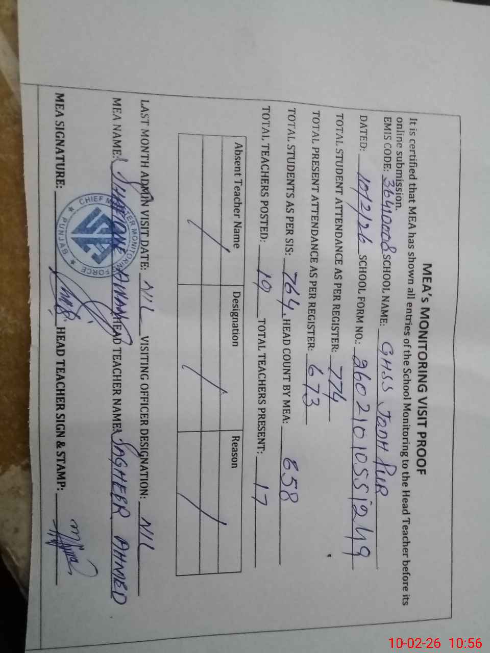 | Attendance Register | Head Teacher | MEA with School | Visit Proof |