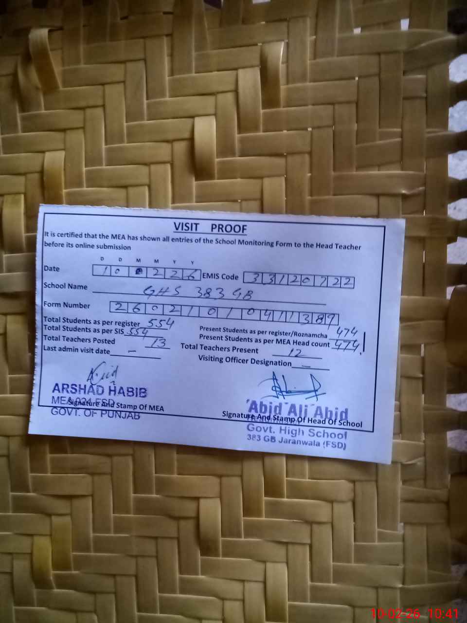 | Certified that this School was Inspected by the Undersigned MEA/DMO Today and the Information Stated Above is as Per Record. | |||||