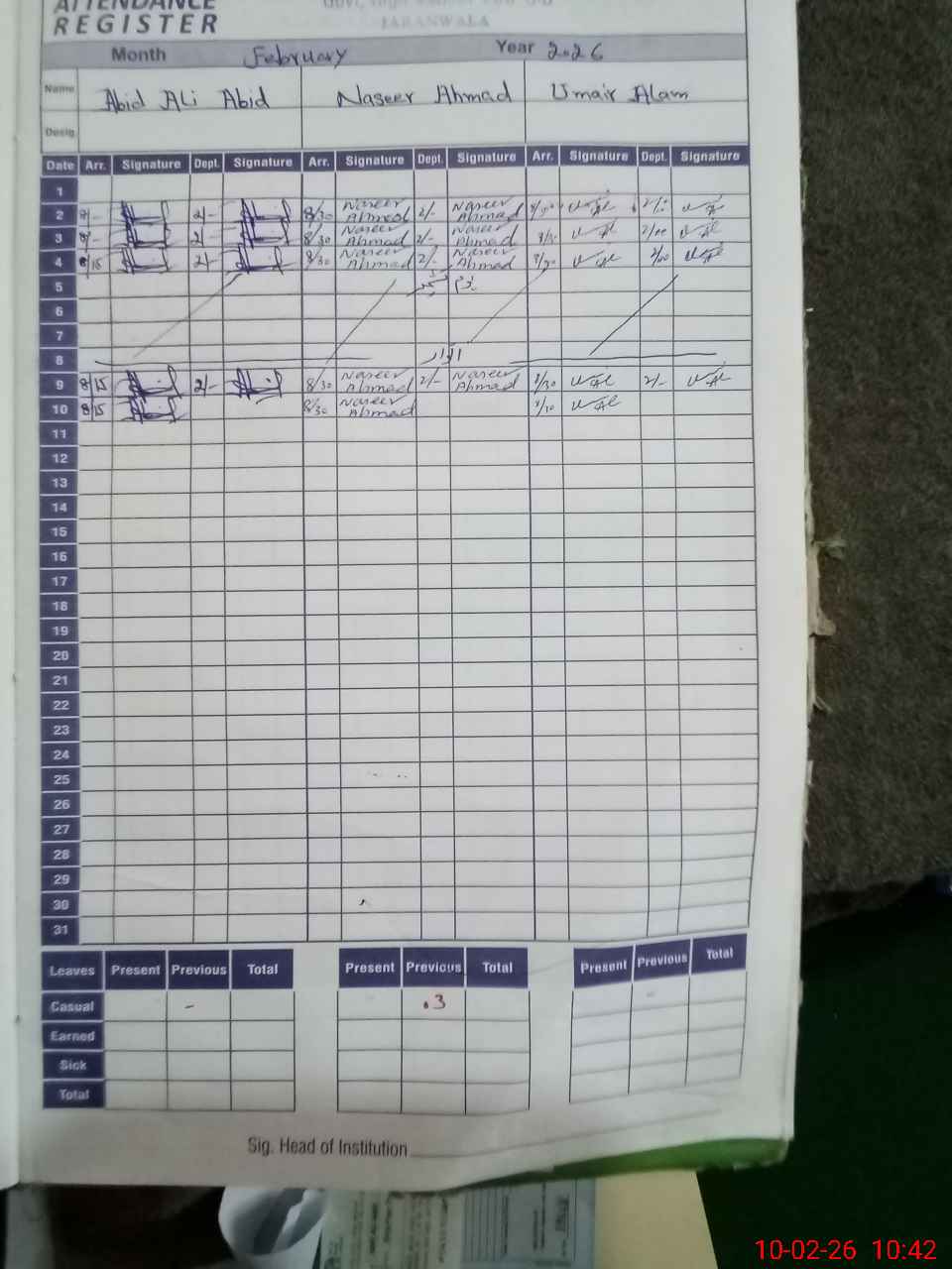 | CNIC | Full Name | Designation | R/C | Absence During Last Calender Month |