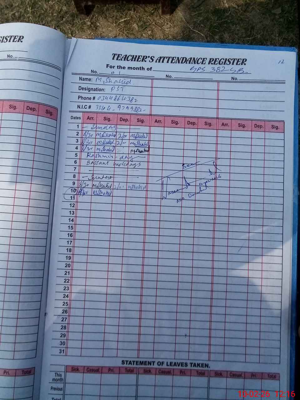 | Name: KA**** AL**** AK**** Designation: (School Headmaster's/Headmistress's) PST Phone/Cell Number: 03**** |