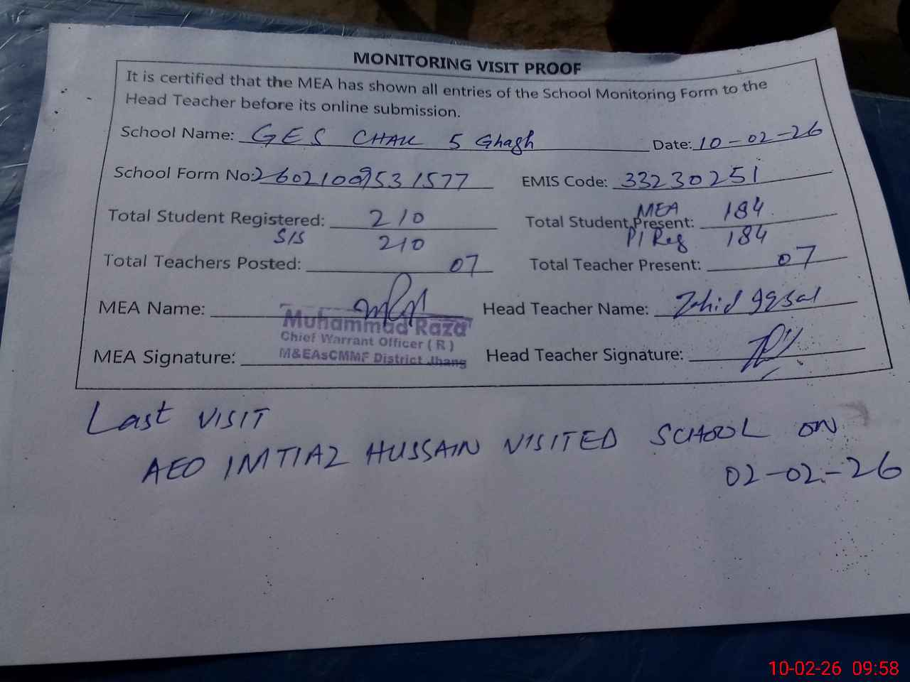 | Attendance Register | Head Teacher | MEA with School | Visit Proof |