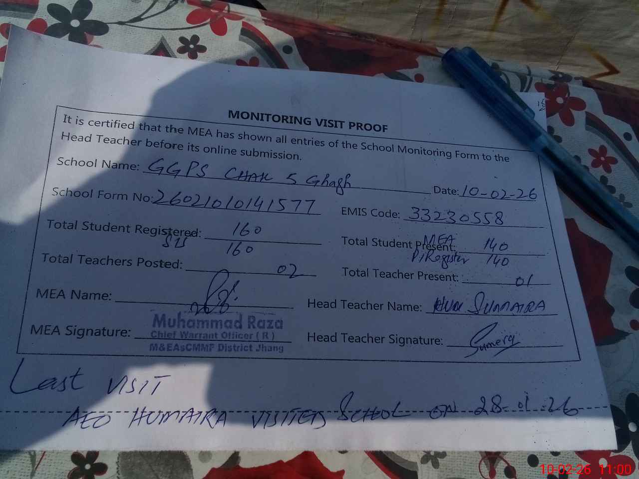 | EMIS Code: 33230558 | Name of School: GGPS CHAK NO 5 GHAGH | |||