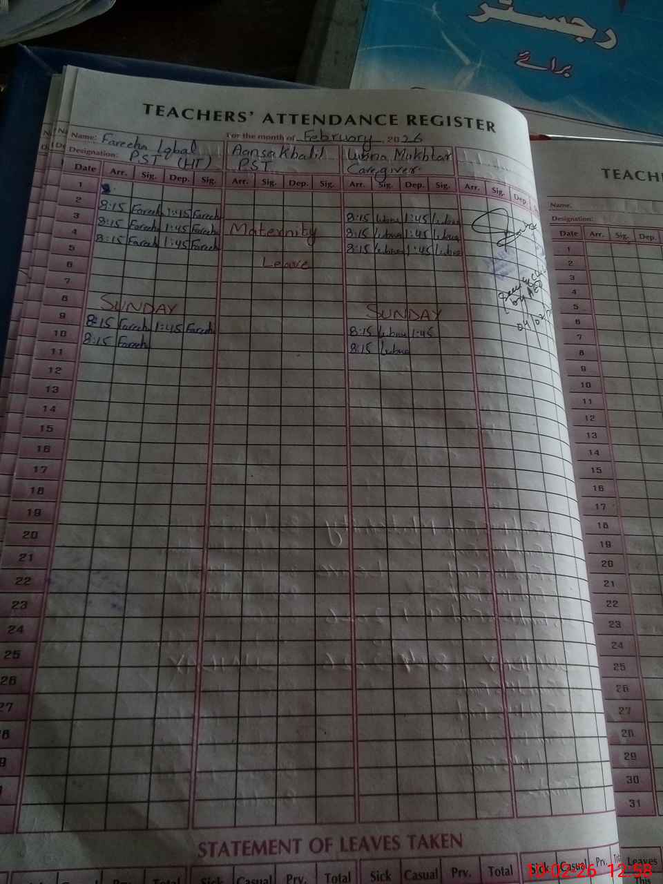 | 33**** | Aa**** Kh**** | PST Science/Maths | Regular | 0 | 0 | 0 | 0 | 0 | 0 | 0 | 0 | 0 | Maternity |